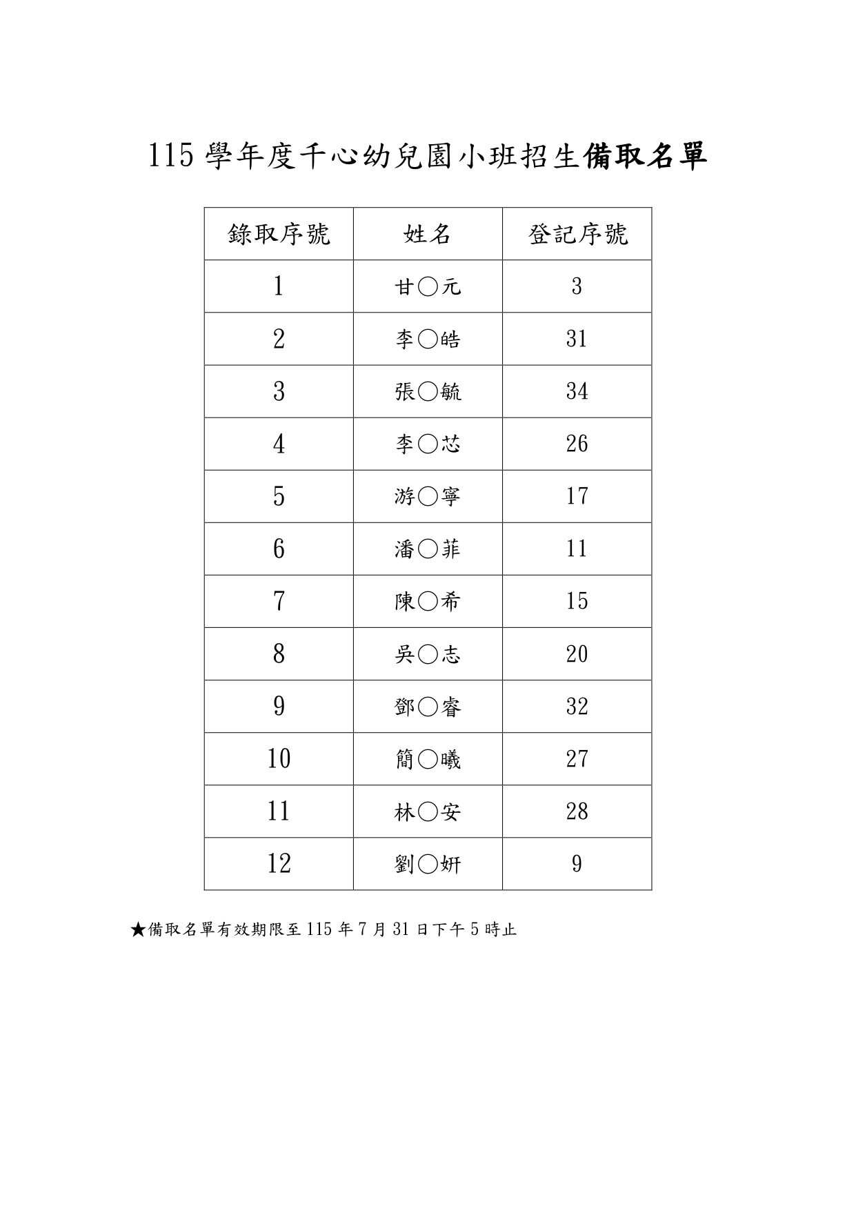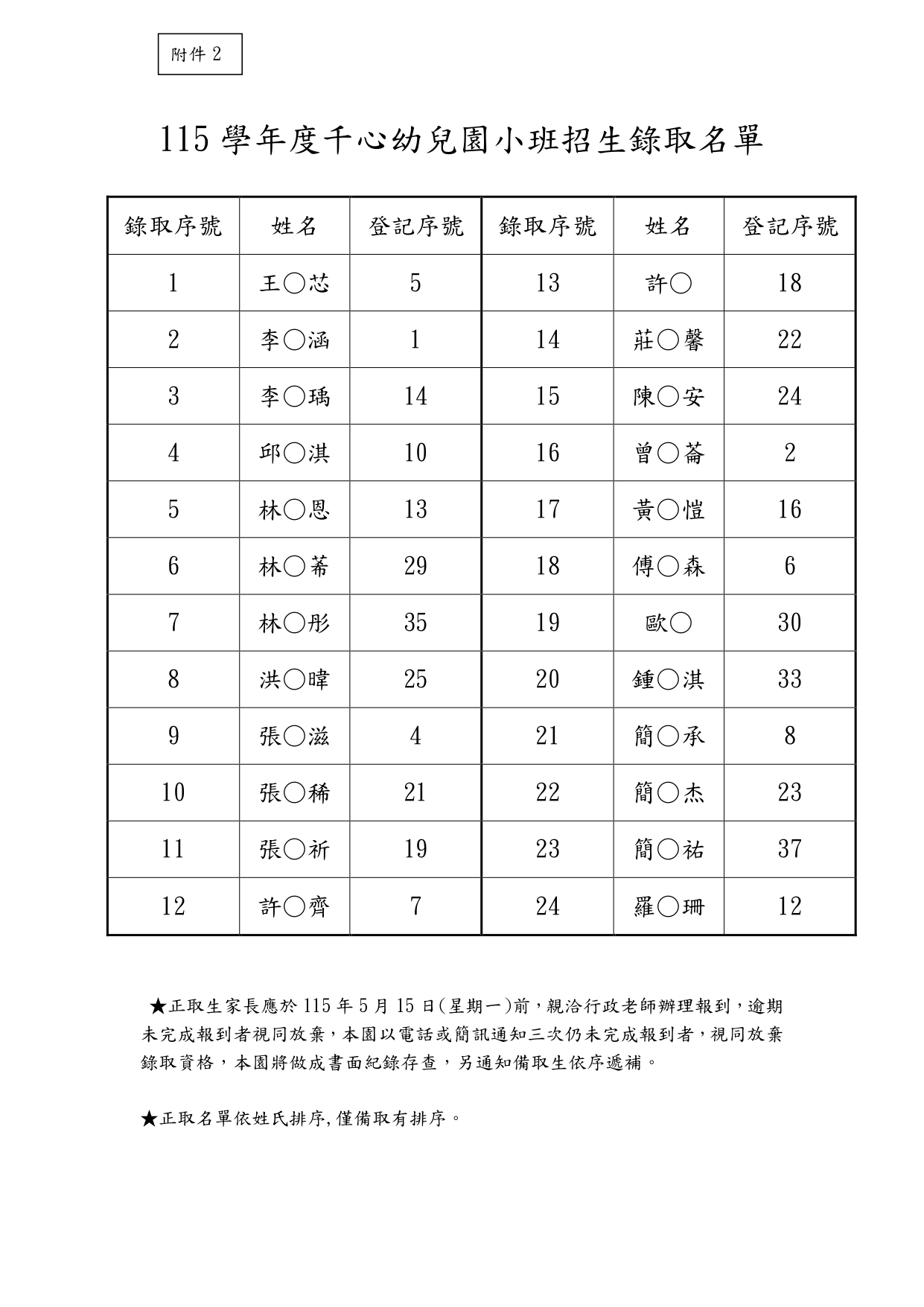 115學年度千心幼兒園小班招生正取.備取名單